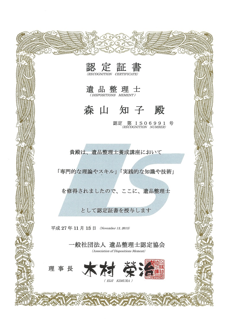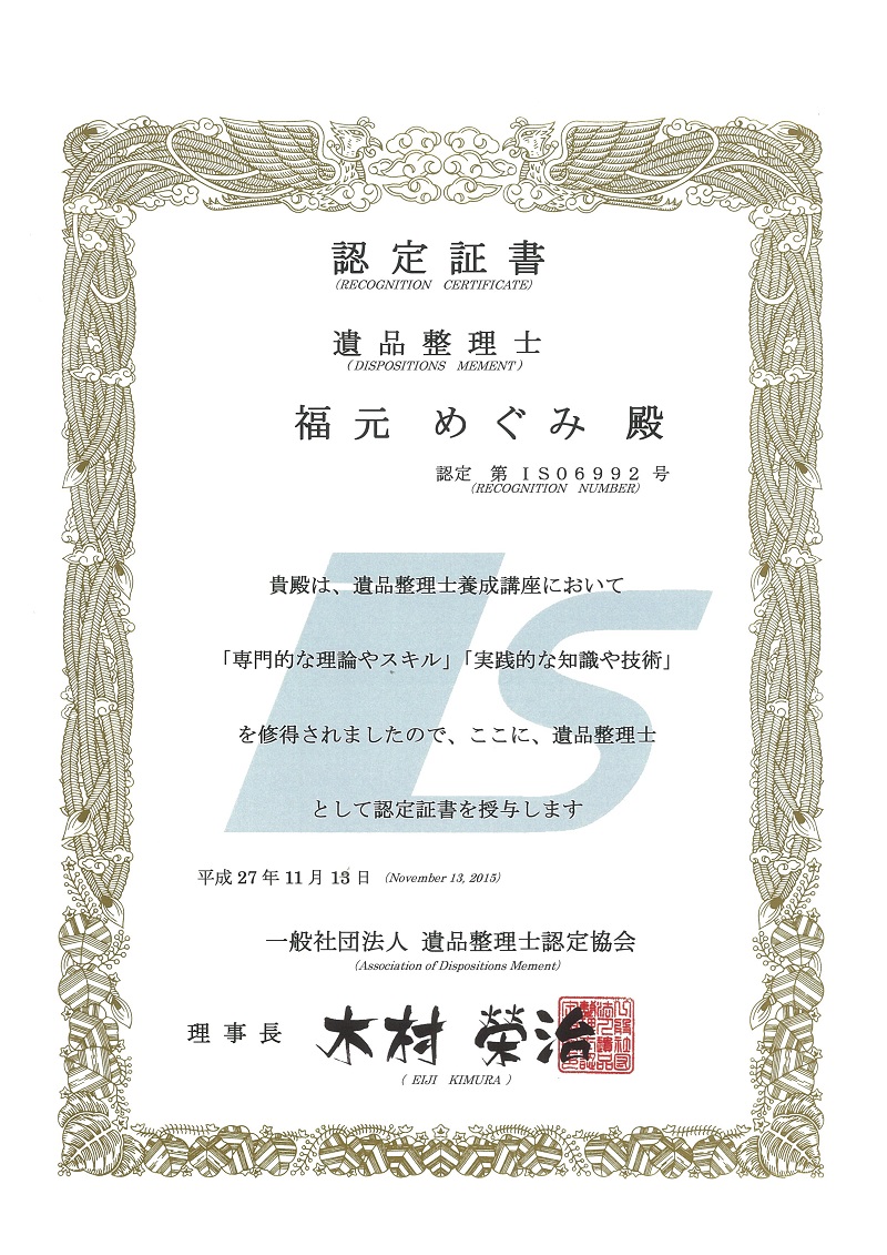 この度、無事「遺品整理士」として認定を受けました。(下記に認定証書)