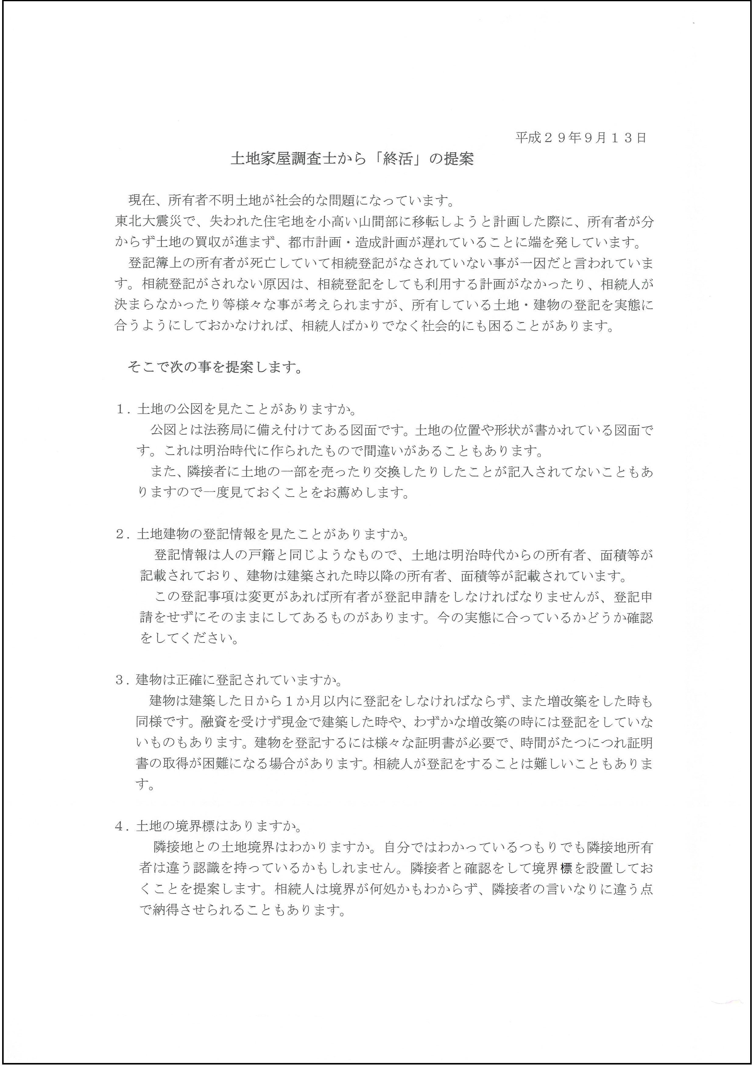 〈土地家屋調査士からの『終活』の提案〉という文書をいただきました。