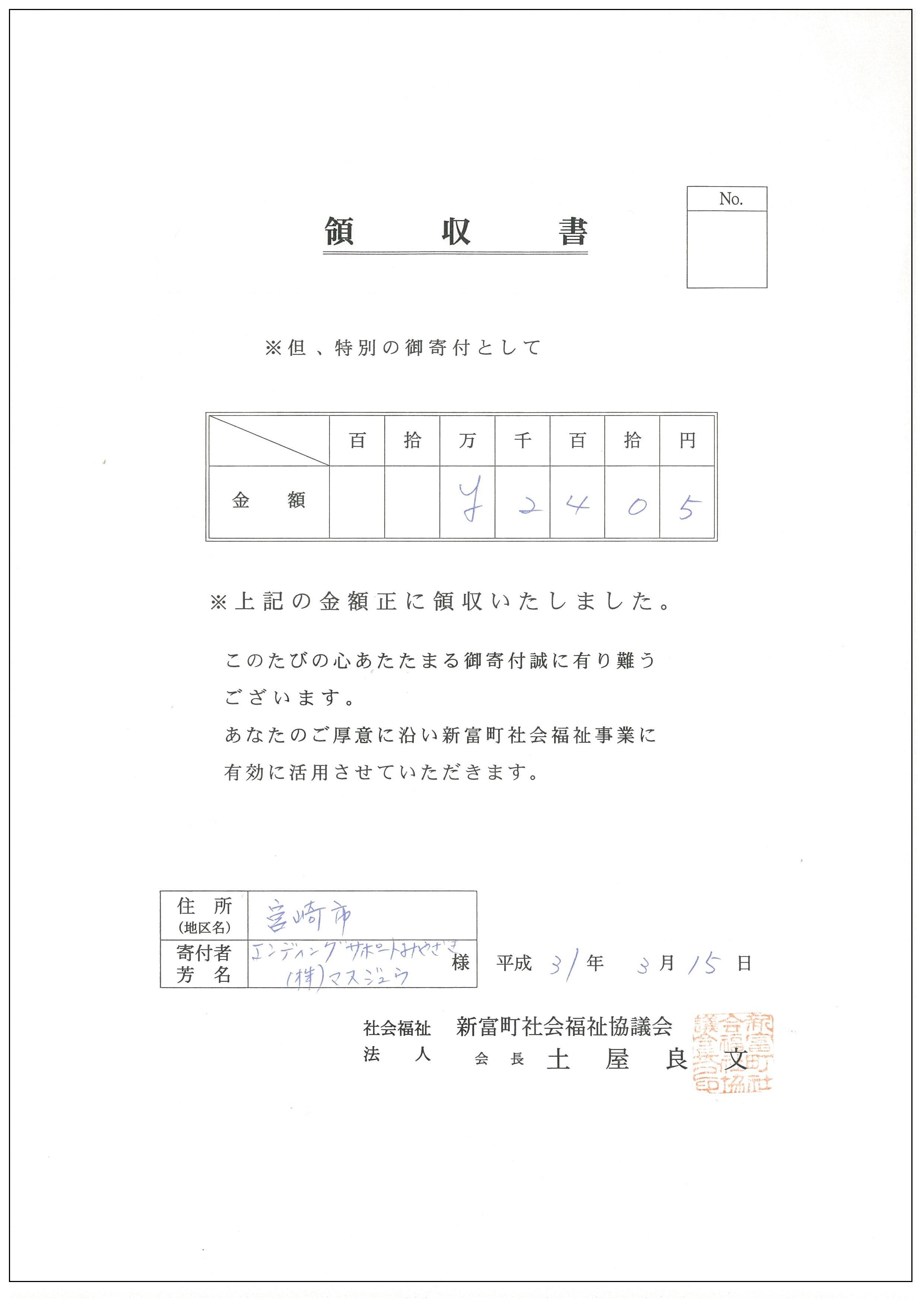 エンディングノートの販売代金による募金を寄付させていただきました。