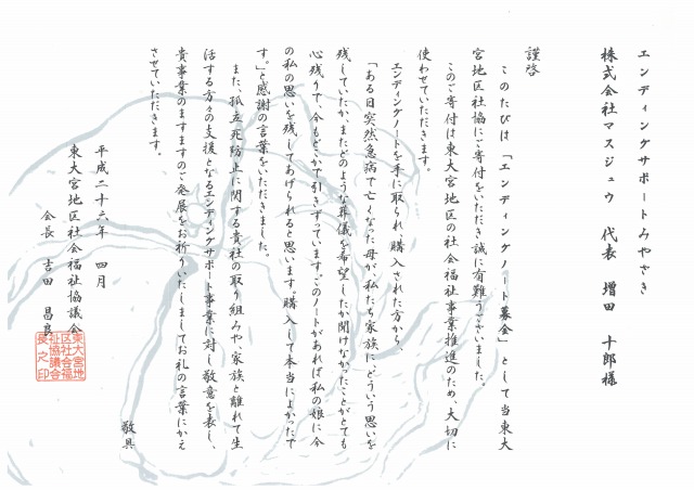 平成26年5月13日(火)東大宮地区社会福祉協議会さまへエンディングノート売上金の寄贈を行いました。