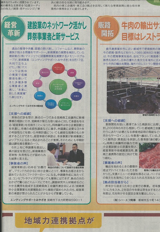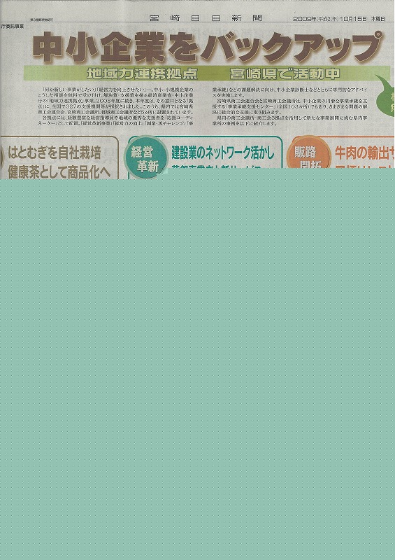 10月15日(木曜日)の宮崎日日新聞で、再度掲載されました。宮崎商工会議所の「地域力連携拠点事業」の一つである「経営革新事業」の支援事例として、当社が紹介されました。県内で初めての事業ということで色々なところで評判になっているとのことです。ありがとうございます。