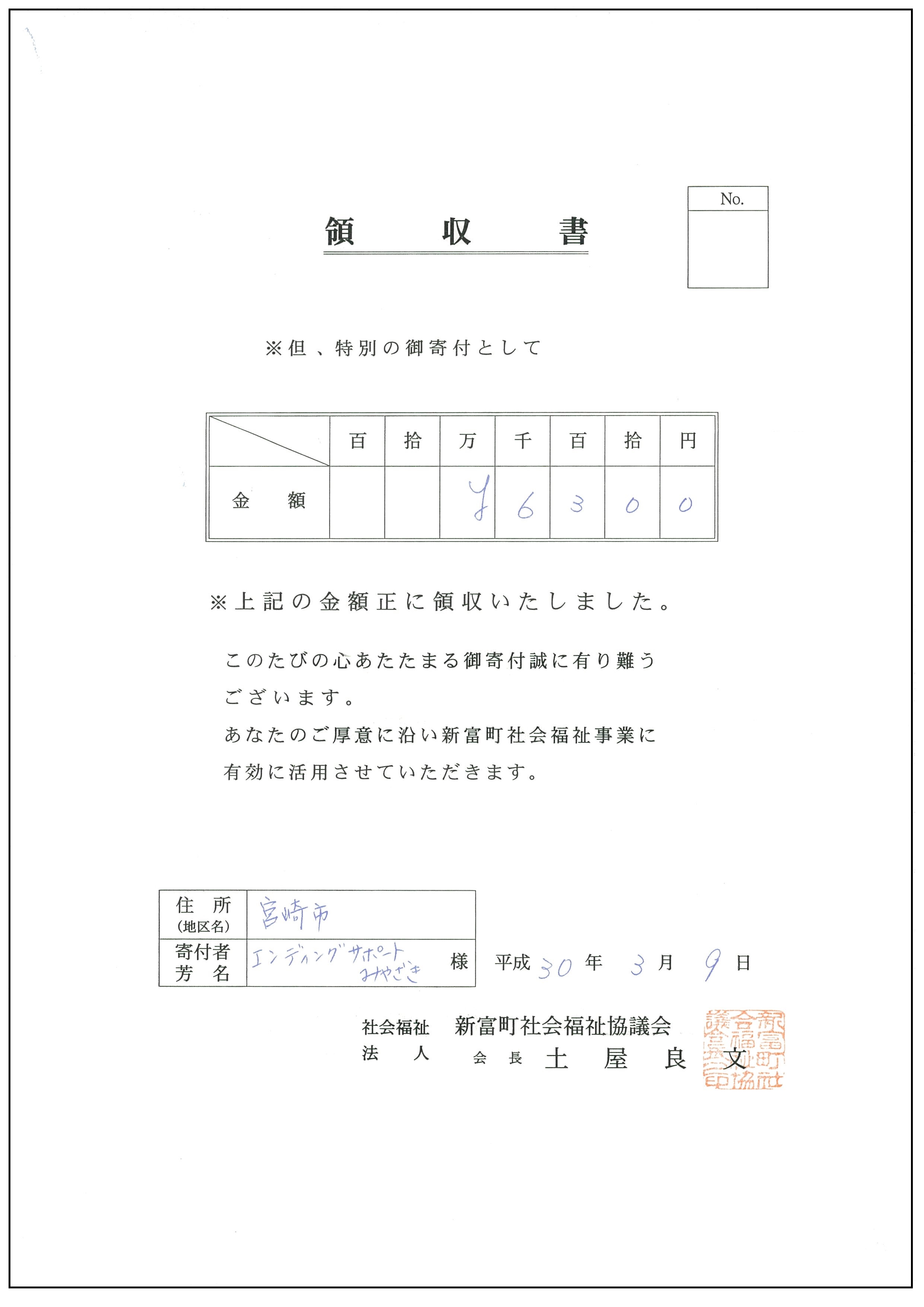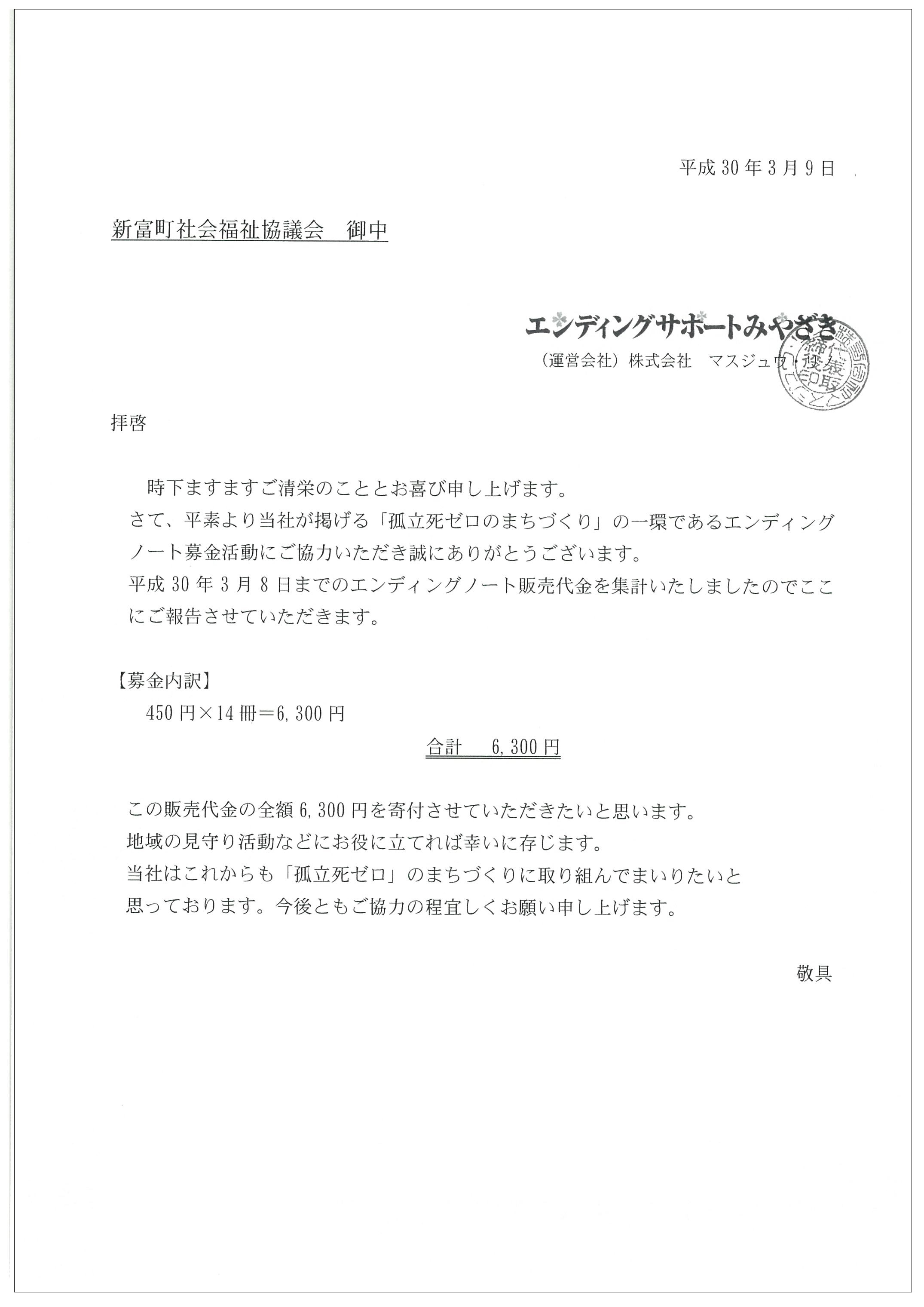 エンディングノートの販売代金について集計し、全額を同社会福祉協議会様へ