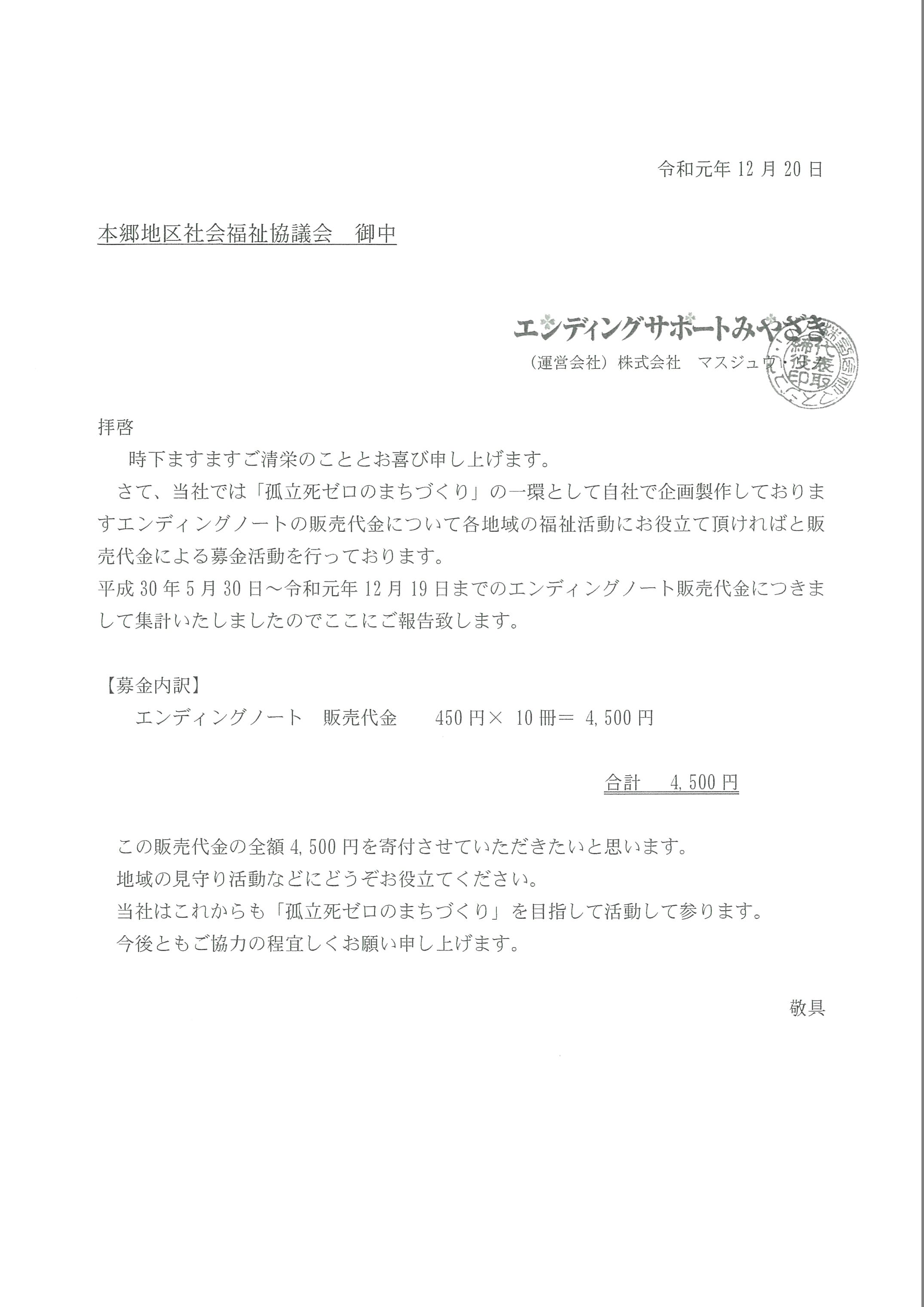 エンディングノートの販売代金について、集計をし全額寄付させていただきました。