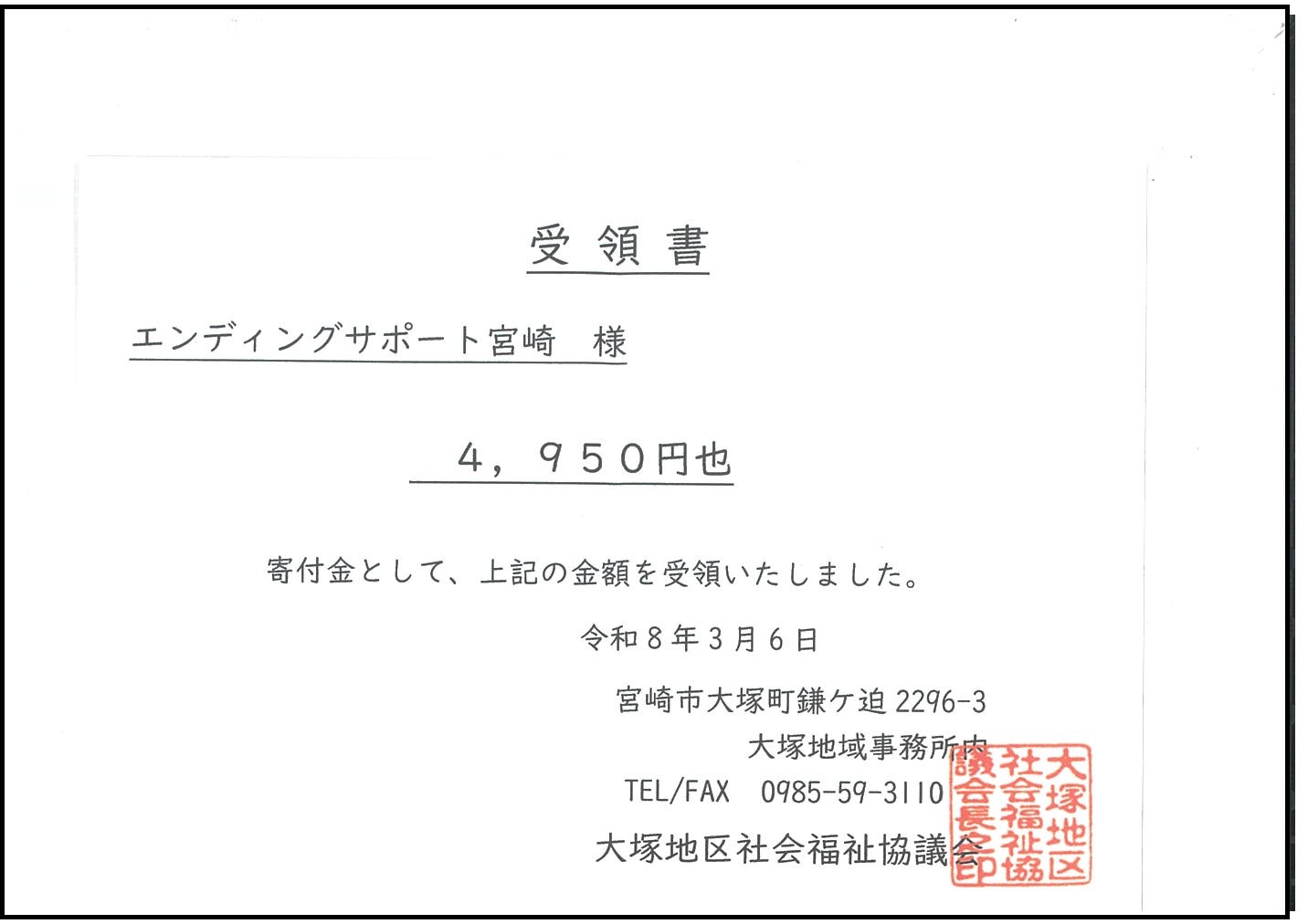 お役立ていただければと各地区の社会福祉協議会へ 全額寄付させていただいております。