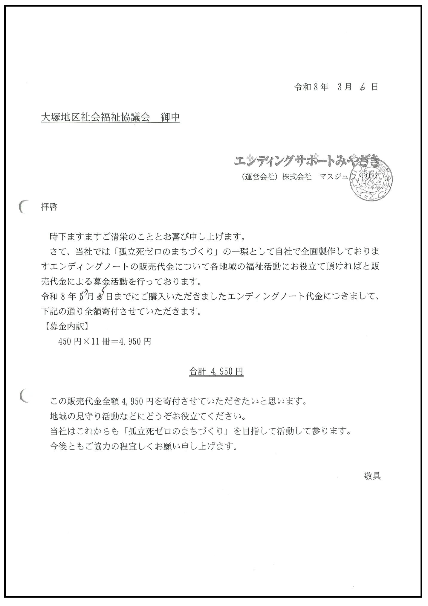 エンディングノートの販売代金を全額寄付させていただきました。