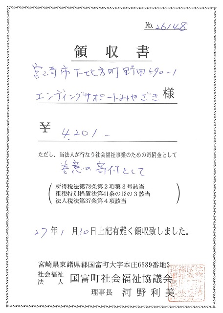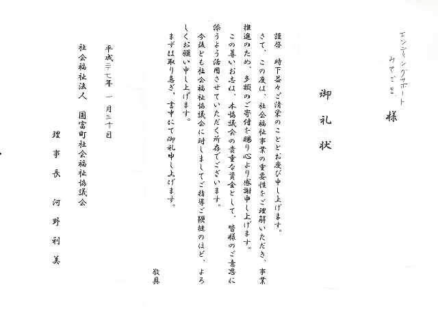 平成27年1月30日(金)国富町社会福祉協議会さまに (有)介護支援ホーム れんげ荘さまにご協力いただきましたエンディングノート売上金の寄贈を行いました。